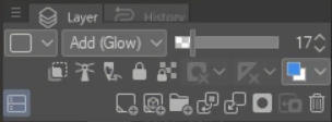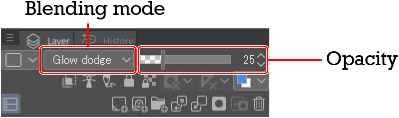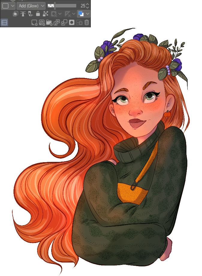 Again, we change the opacity and the blending bode to make these colors glow. I set it to Add (Glow) and an opacity of 25%. Of course, it is important to play with the settings first to see which one is going to create a more realistic effect. This can depend on your base colors. For example, reds might not work this well in a cooler-toned drawing.
