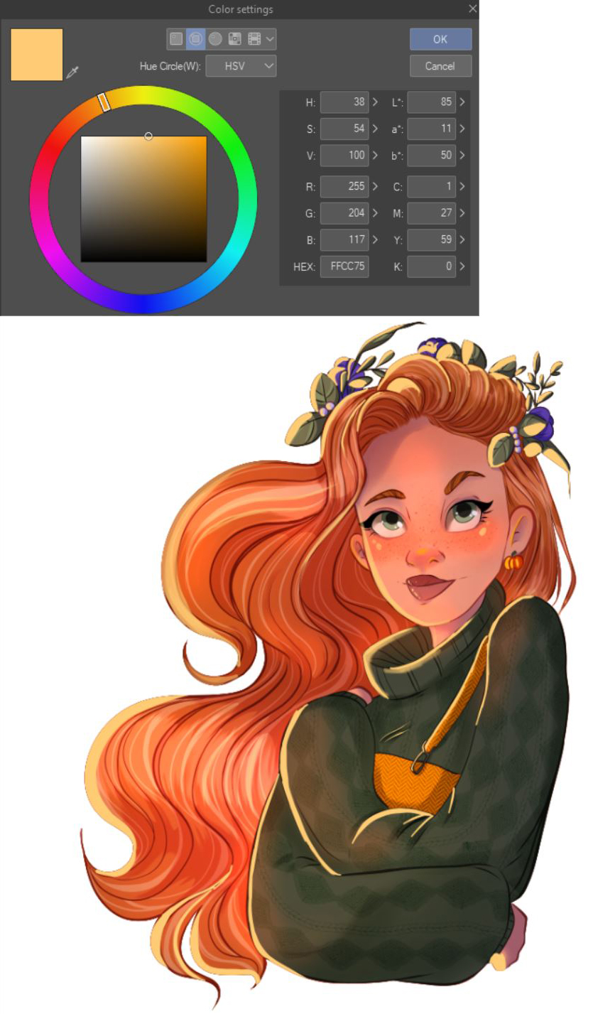 Either method is ok. We follow the process of all the elements (hair, eyes, clothes, lips, eyebrows, earring, and floral decorations), coloring them in a new individual layer.