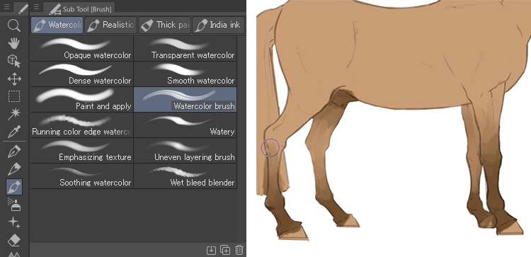 When working with different shades of color, my advice is to use the Watercolor Brush in a shade that is darker than the base color of the fur for simple shading. Look at the following images: