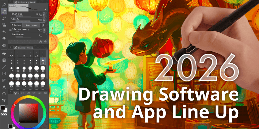 It also has a full range of manga production features such as screentones and frame border functions. It can also support B5 or A5 canvases at 600 dpi resolution, a requirement for printing black-and-white comics.