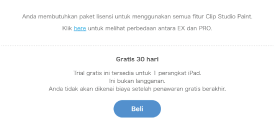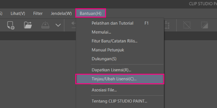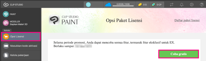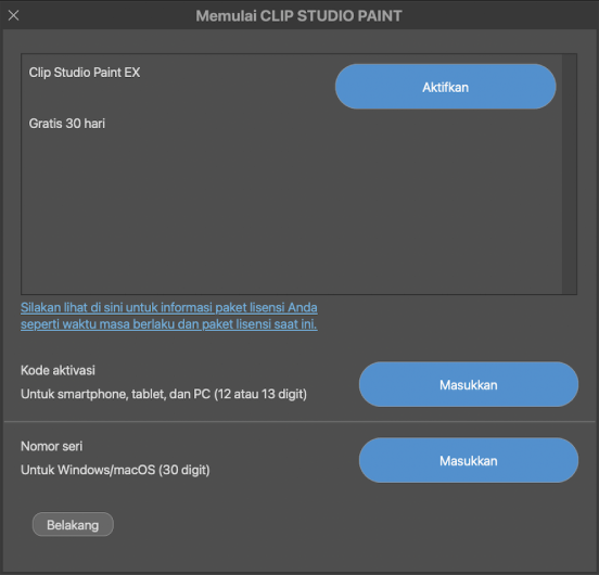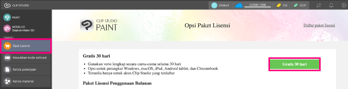 Luncurkan Clip Studio dan klik Opsi Lisensi > gratis 30 hari.
