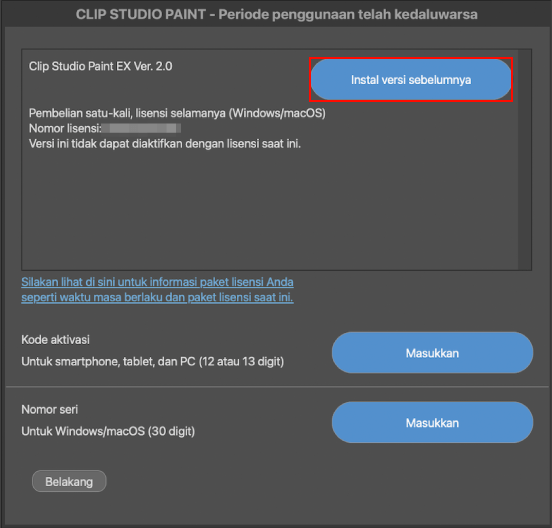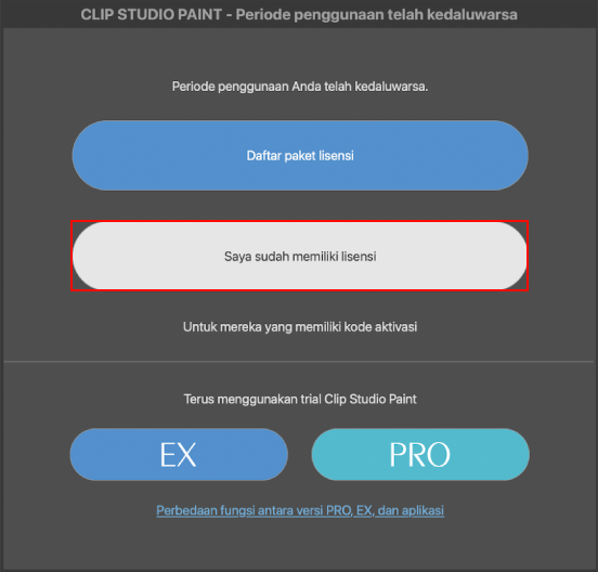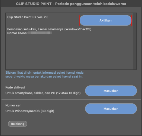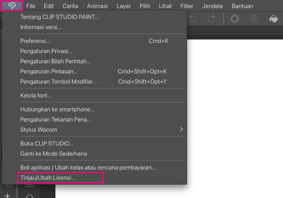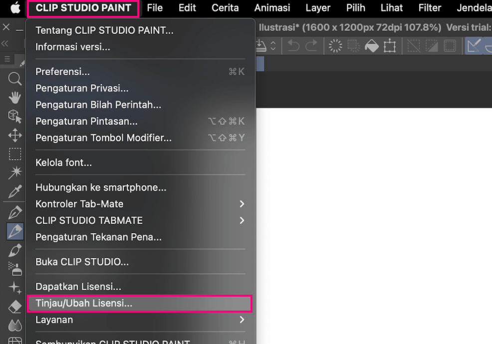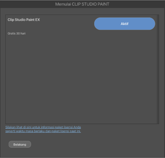 Klik Aktifkan pada trial gratis 30 hari Clip Studio Paint EX di bawah menu CLIP STUDIO PAINT > Tinjau/Ubah Lisensi > Lisensi Anda.