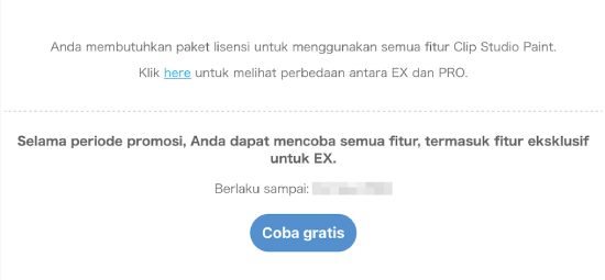 Luncurkan Clip Studio dan klik Opsi Lisensi > tombol Coba gratis.