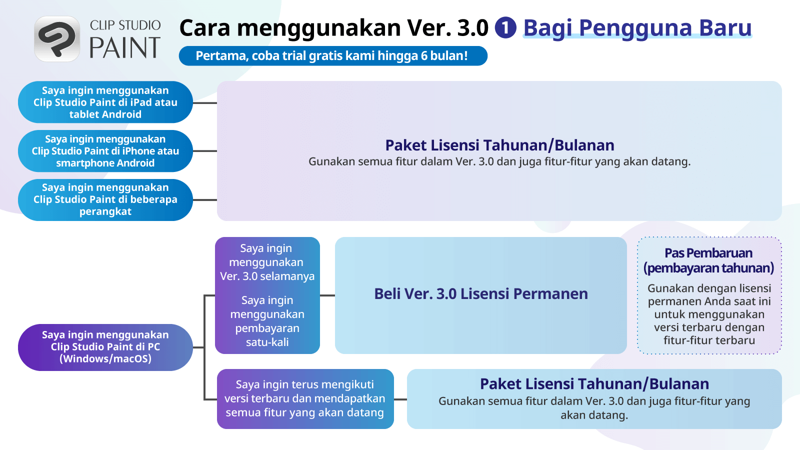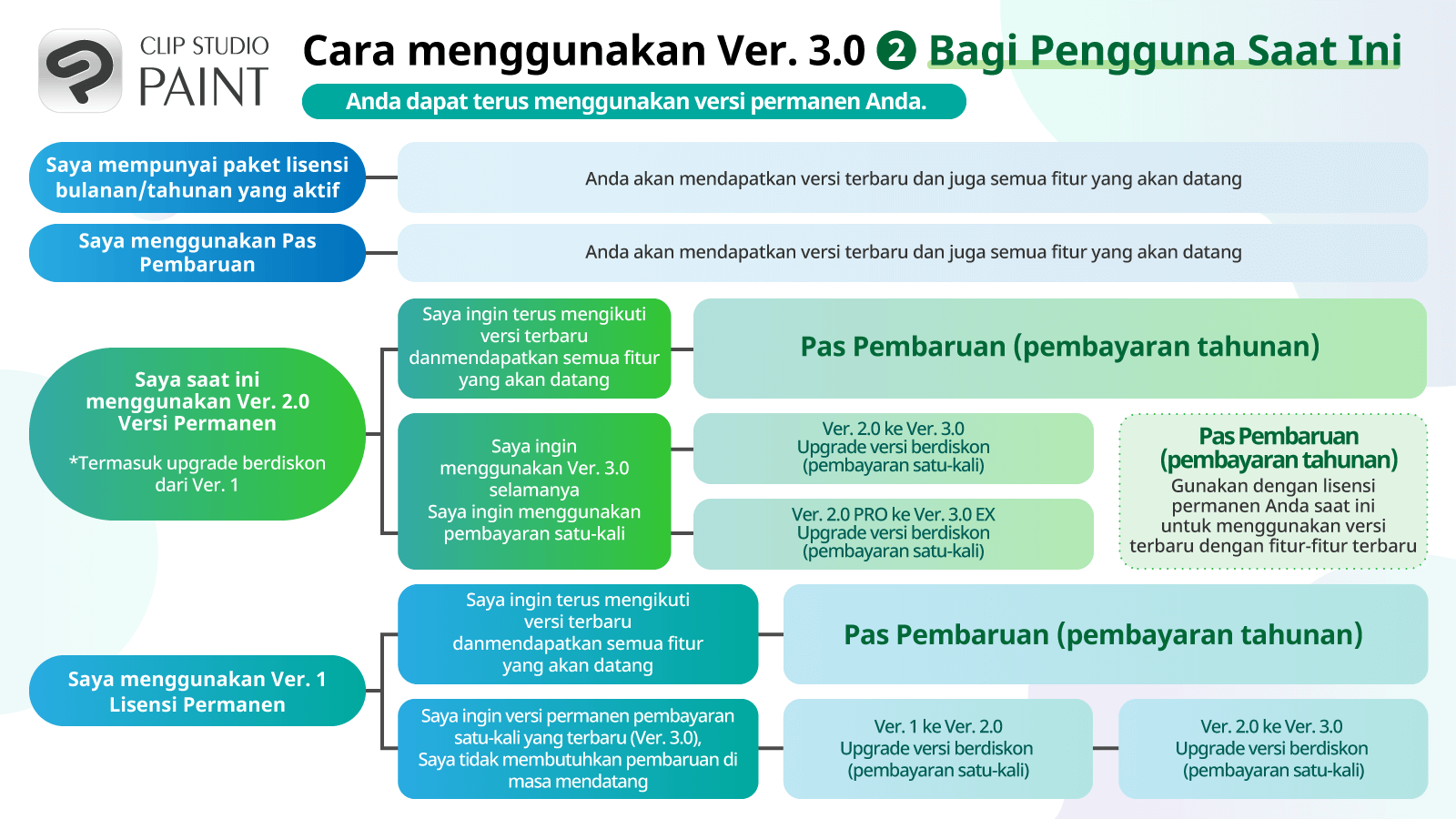 Dapatkan Pas Pembaruan untuk menggunakan semua fitur terbaru termasuk Ver. 3.0 dan fitur-fitur baru yang akan ditambahkan sepanjang tahun 2024 dengan harga yang menarik. Anda dapat terus menggunakan Ver.1 tanpa batas waktu selamanya.