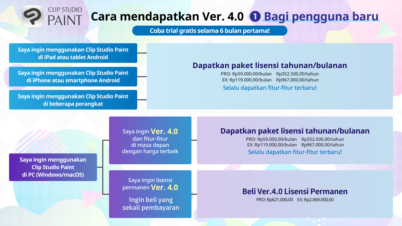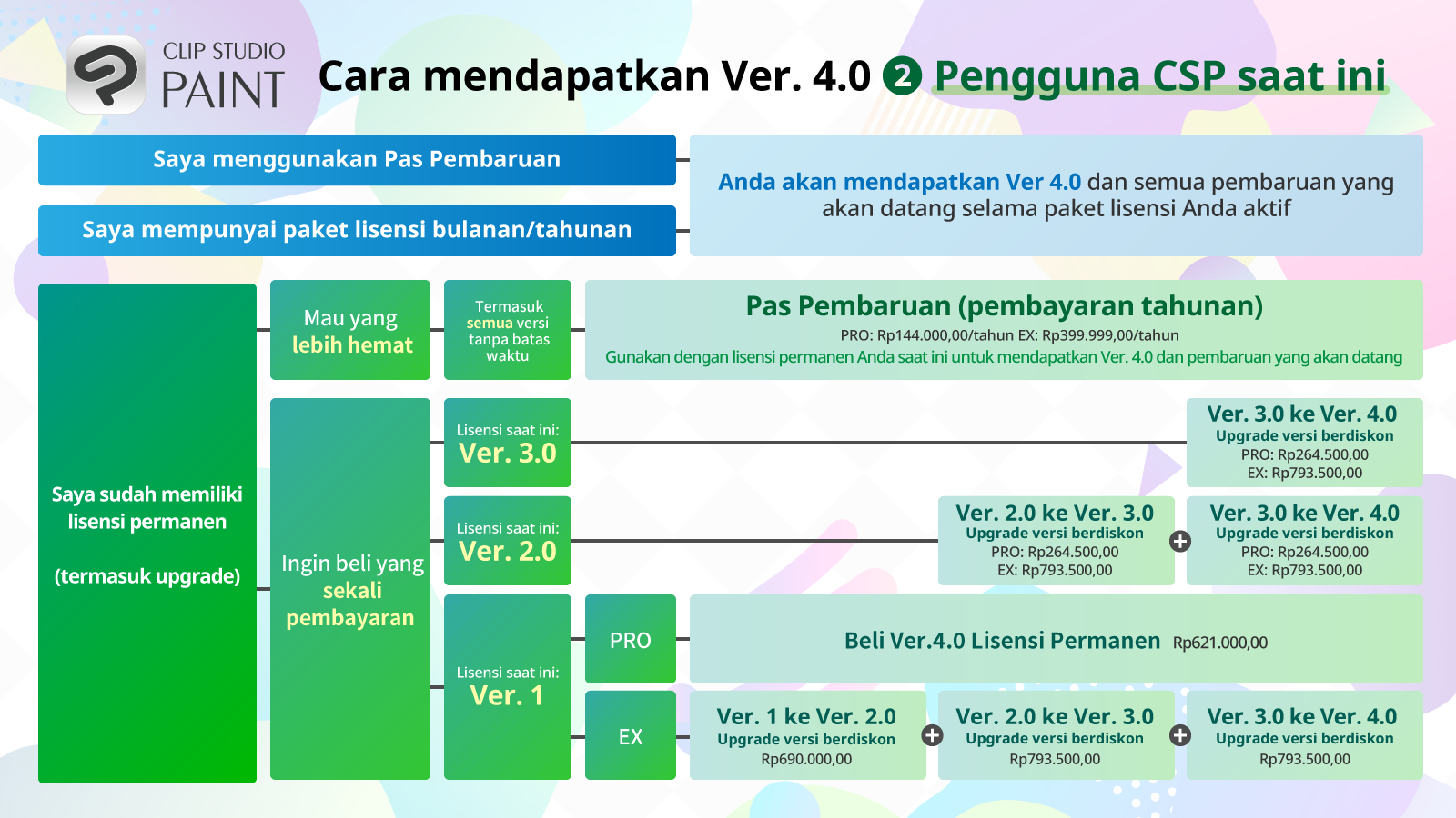 - Kami merekomendasikan agar pengguna lisensi permanen Ver. 1 membeli Pas Pembaruan (tahunan) untuk mengakses versi terbaru dengan harga lebih murah.