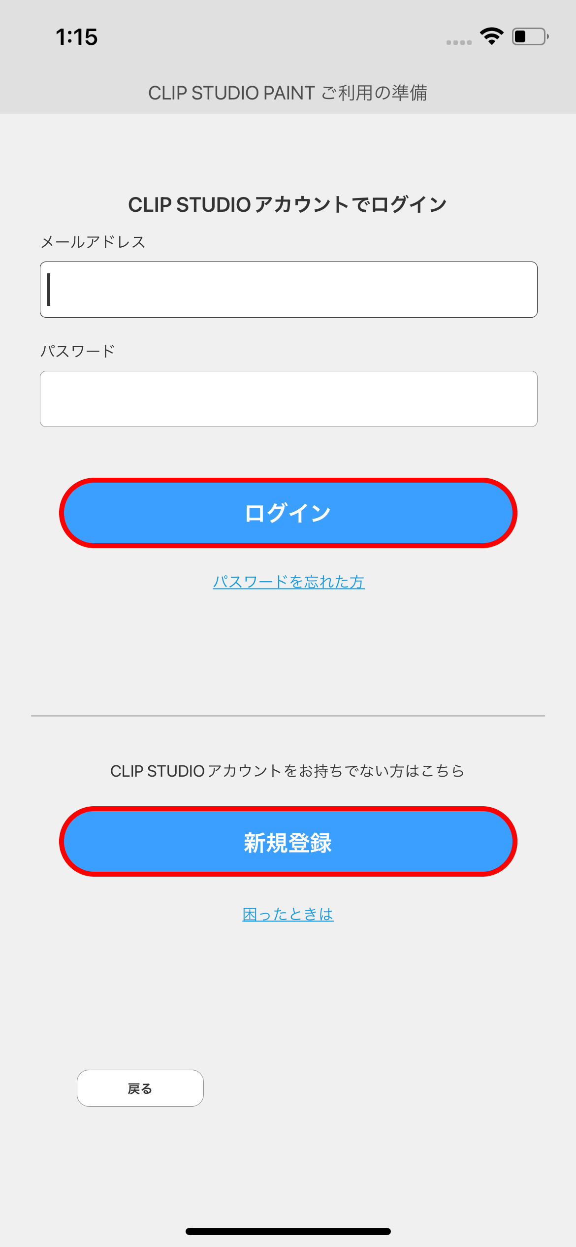 ダウンロード(Windows / macOS)はこちら4. [CLIP STUDIO PAINT ご利用の準備]画面で[ライセンスをお持ちの方/無料期間をお申込みの方]を選択します。ログイン画面が表示された場合は、2-(3)のアプリストアでの契約の際に使用した、メールアドレスとパスワードを入力してログインします。