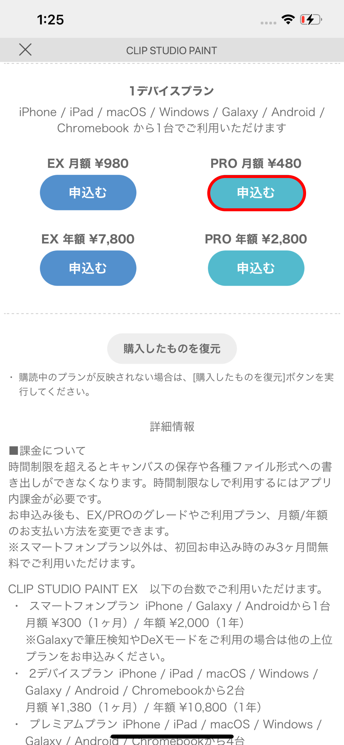 1. PCでご利用の場合でもスマートフォンまたはタブレット等でApp Store またはGoogle Playストアでご利用のプランを申込みいただけます。