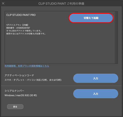 5. ライセンス一覧が表示されるので、2.で契約したプランを選んで[起動]または[切替えて起動]をクリックします。CLIP STUDIO PAINTが起動し、ご利用いただけます。