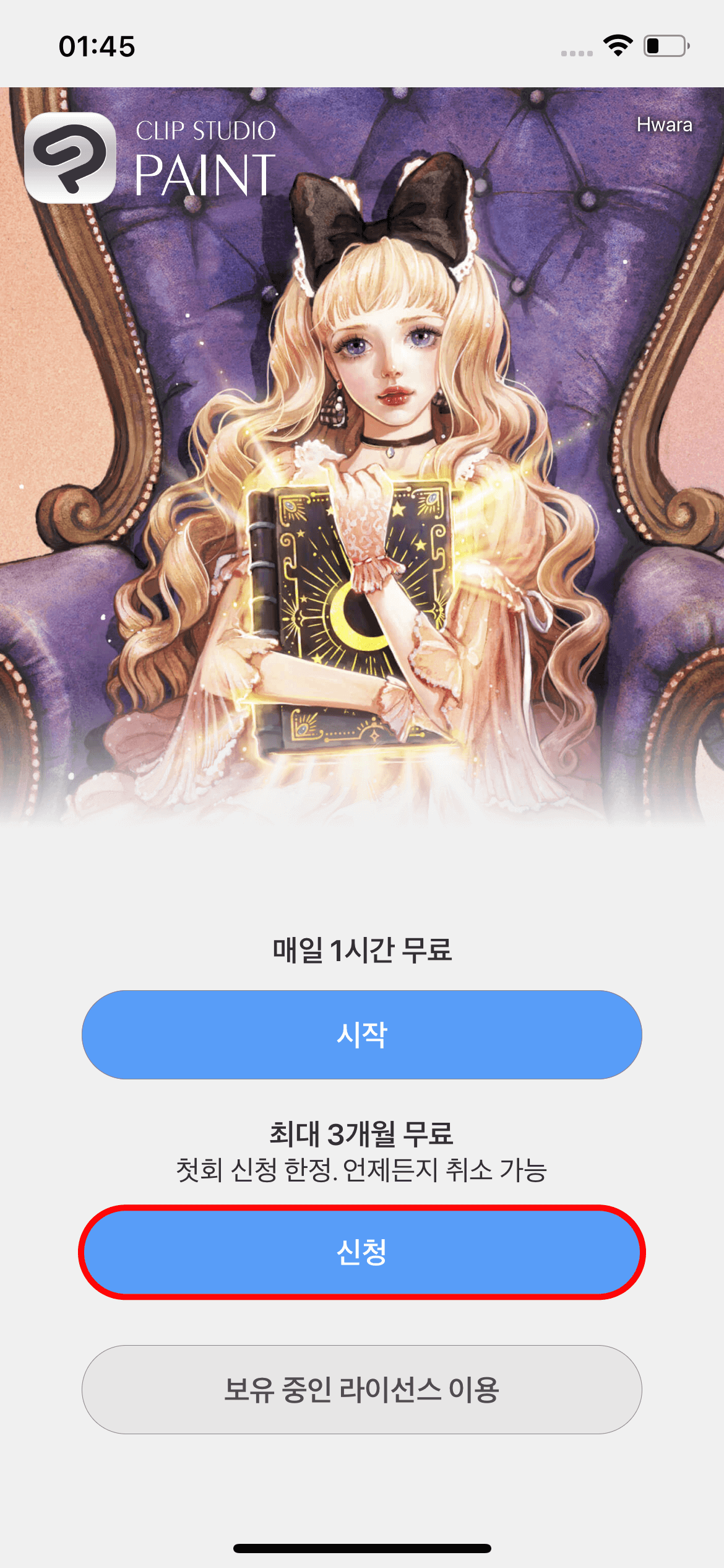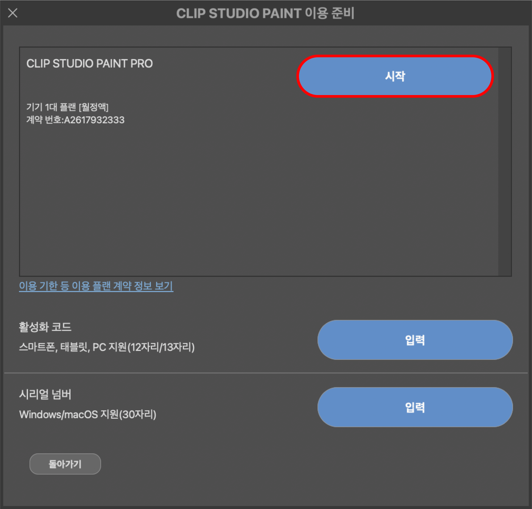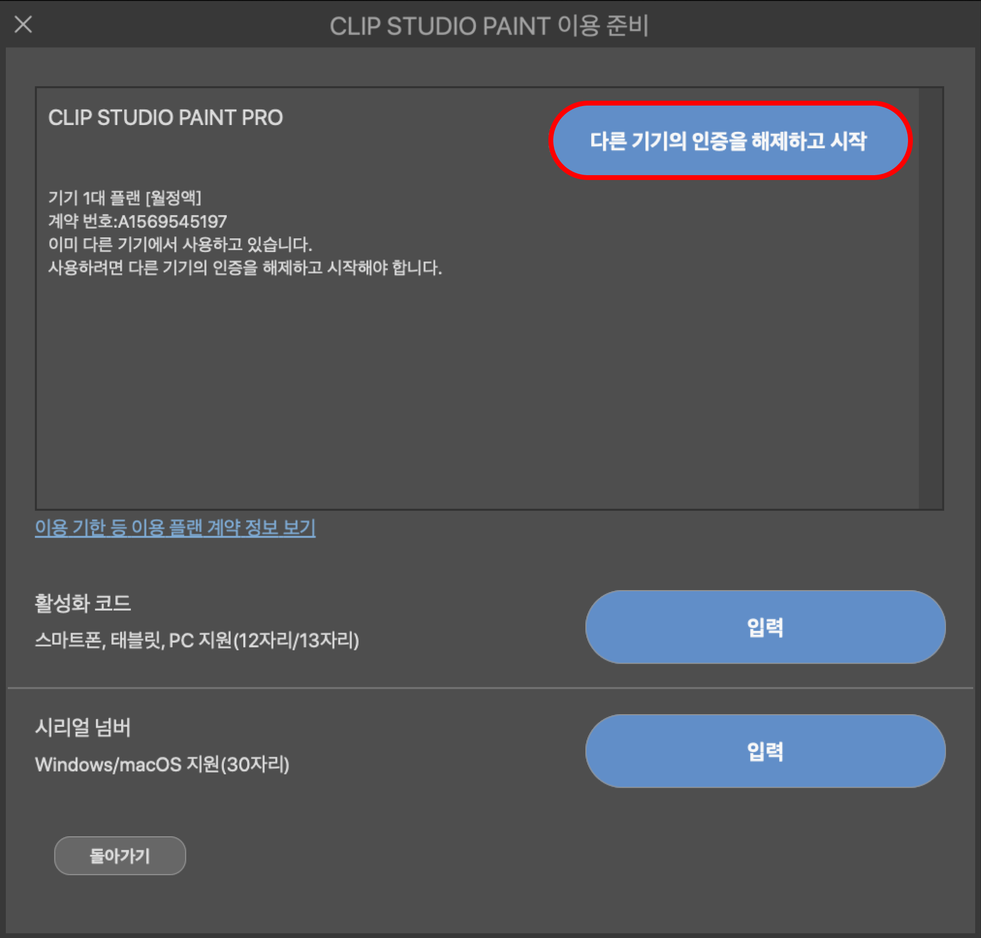 5. 라이센스 목록이 표시되므로 2.에서 계약한 플랜을 선택하고 [시작] 또는 [다른 기기의 인증을 해제하고 시작]을 클릭합니다. CLIP STUDIO PAINT가 시작되어 사용하실 수 있습니다.