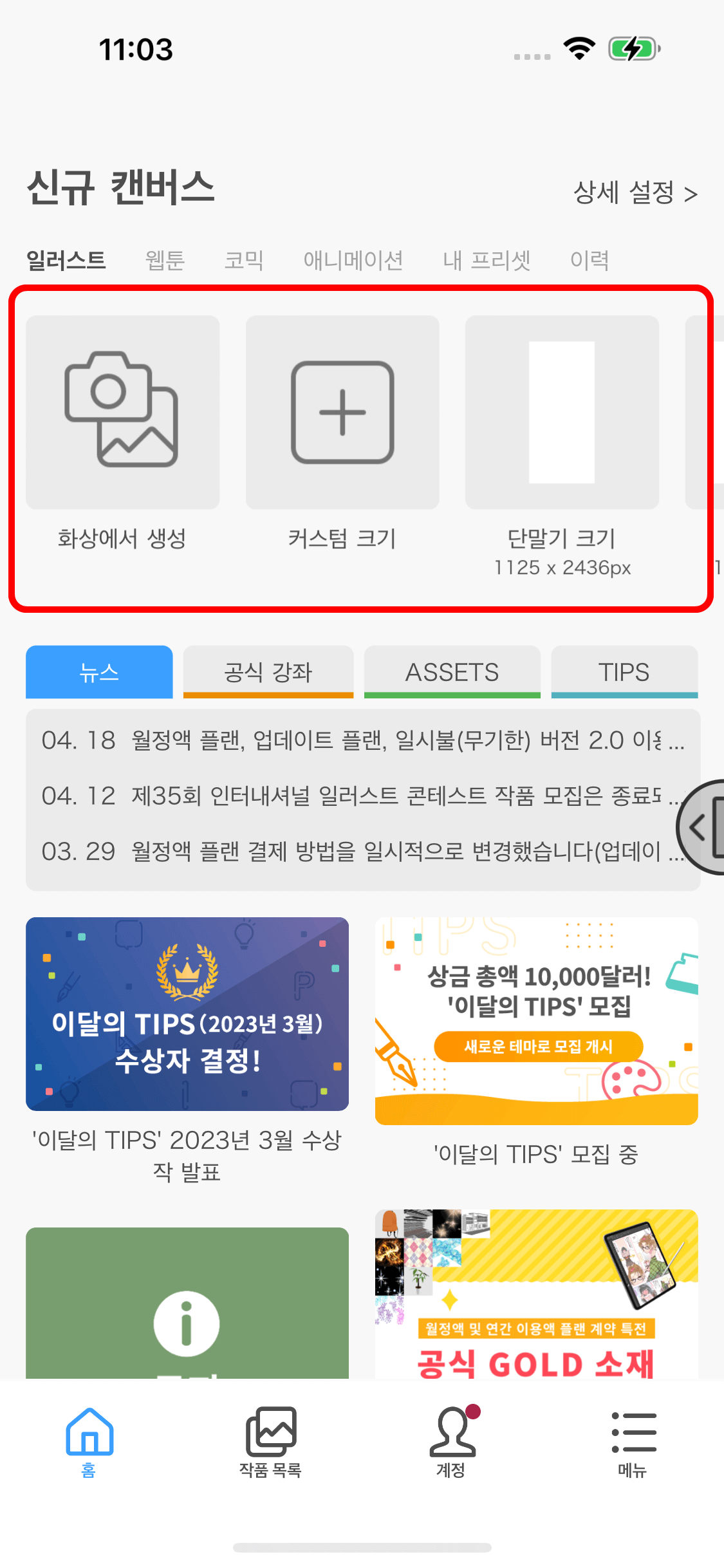 (2) 신규 캔버스에서 임의의 캔버스를 엶