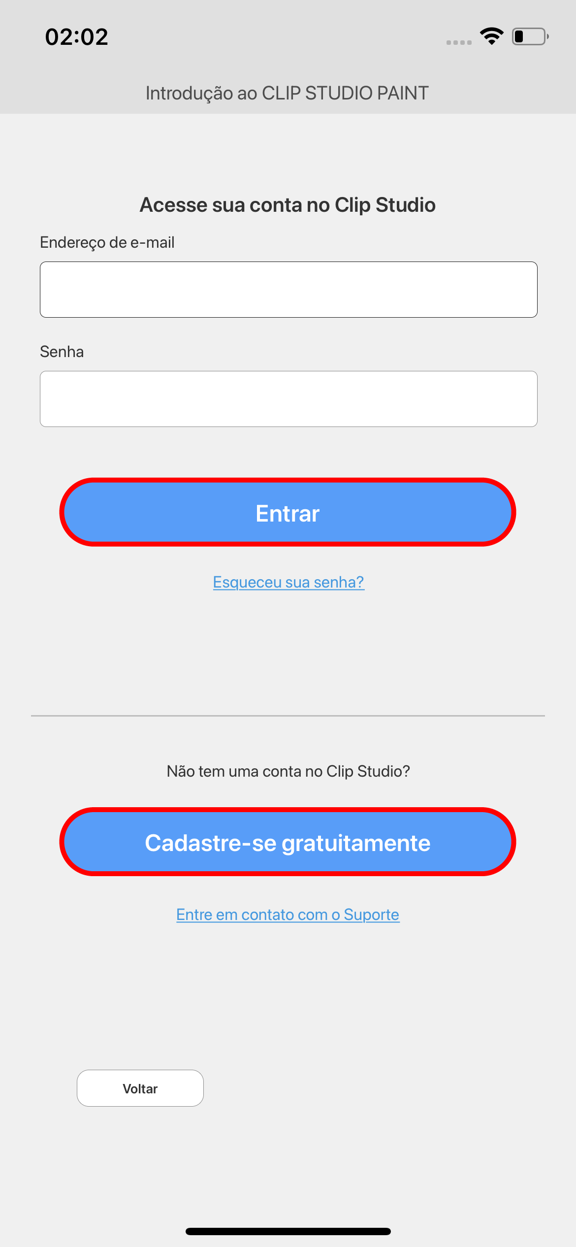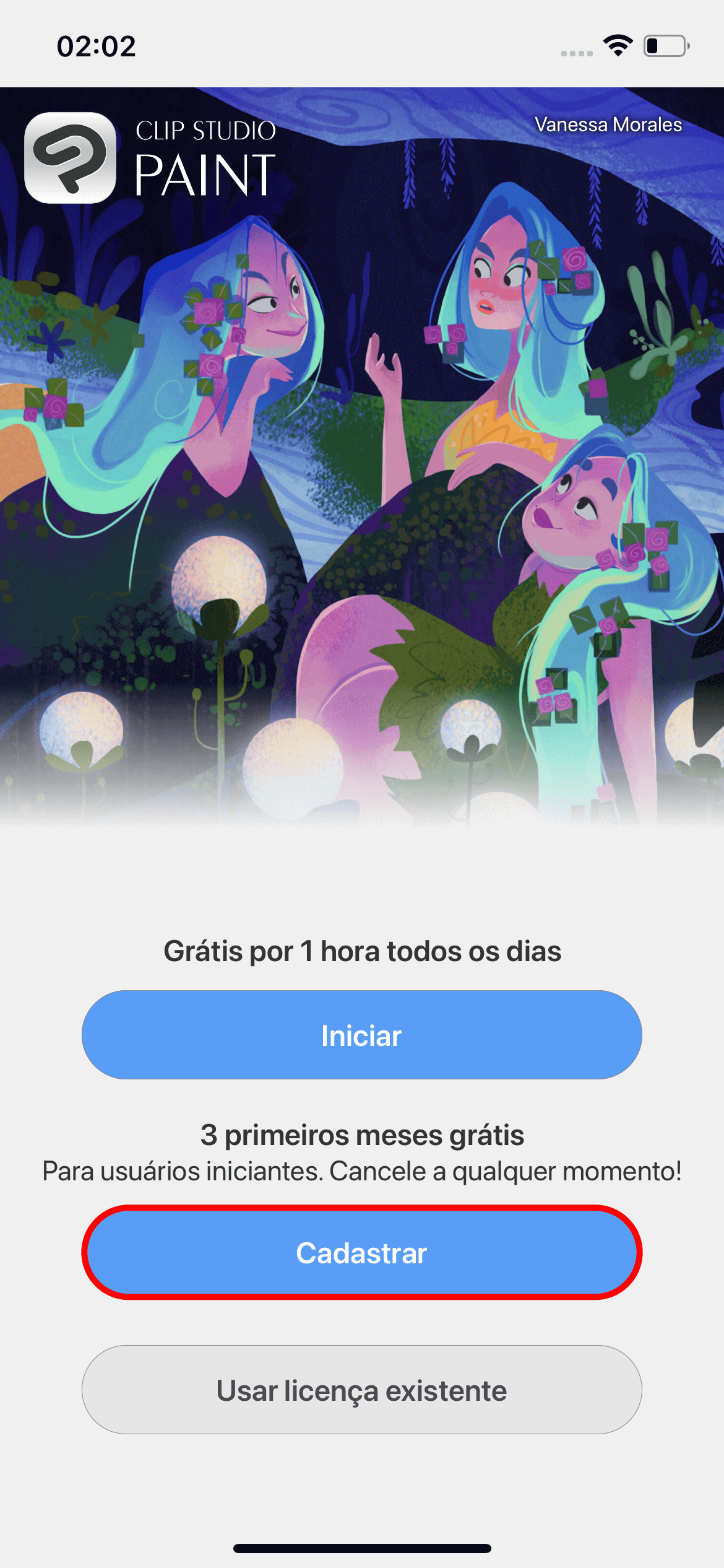 Baixar aqui para Windows/macOS4. Na tela de execução do Clip Studio Paint, toque em "Eu já tenho uma licença". Quando a tela de login aparecer, insira o endereço de e-mail e a senha da conta Clip Studio usada para comprar a licença na App Store.