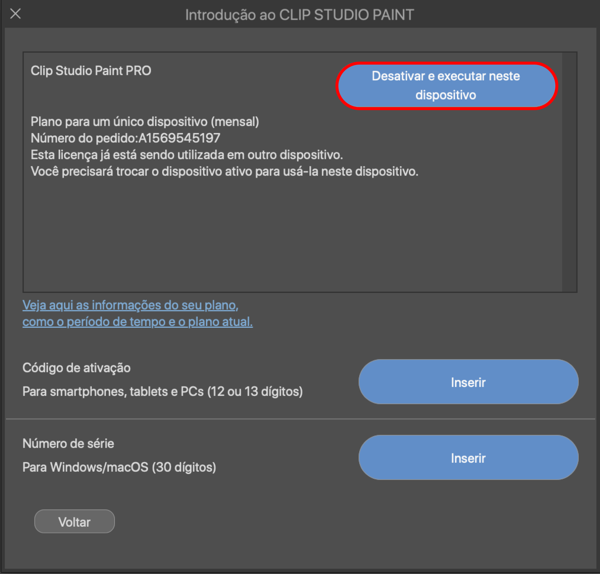 5. A lista de licenças vai aparecer. Selecione o plano mensal e toque em "Executar" ou "Desativar e executar neste dispositivo". O Clip Studio Paint será iniciado com a licença do seu plano mensal.