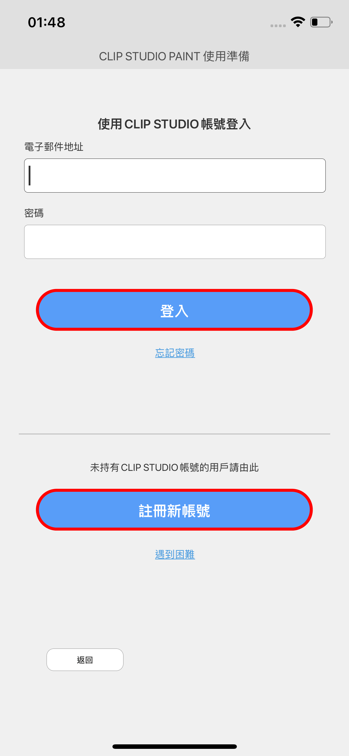 下載(Windows/macOS)請由此4. 於[CLIP STUDIO PAINT 使用準備]畫面中選擇[持有許可證的用戶 申請免費使用期的用戶]。當顯示登入畫面時,請以2-(3)應用程式商店簽約時使用的電子郵件與密碼登入帳號。