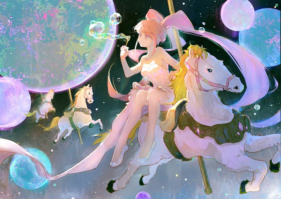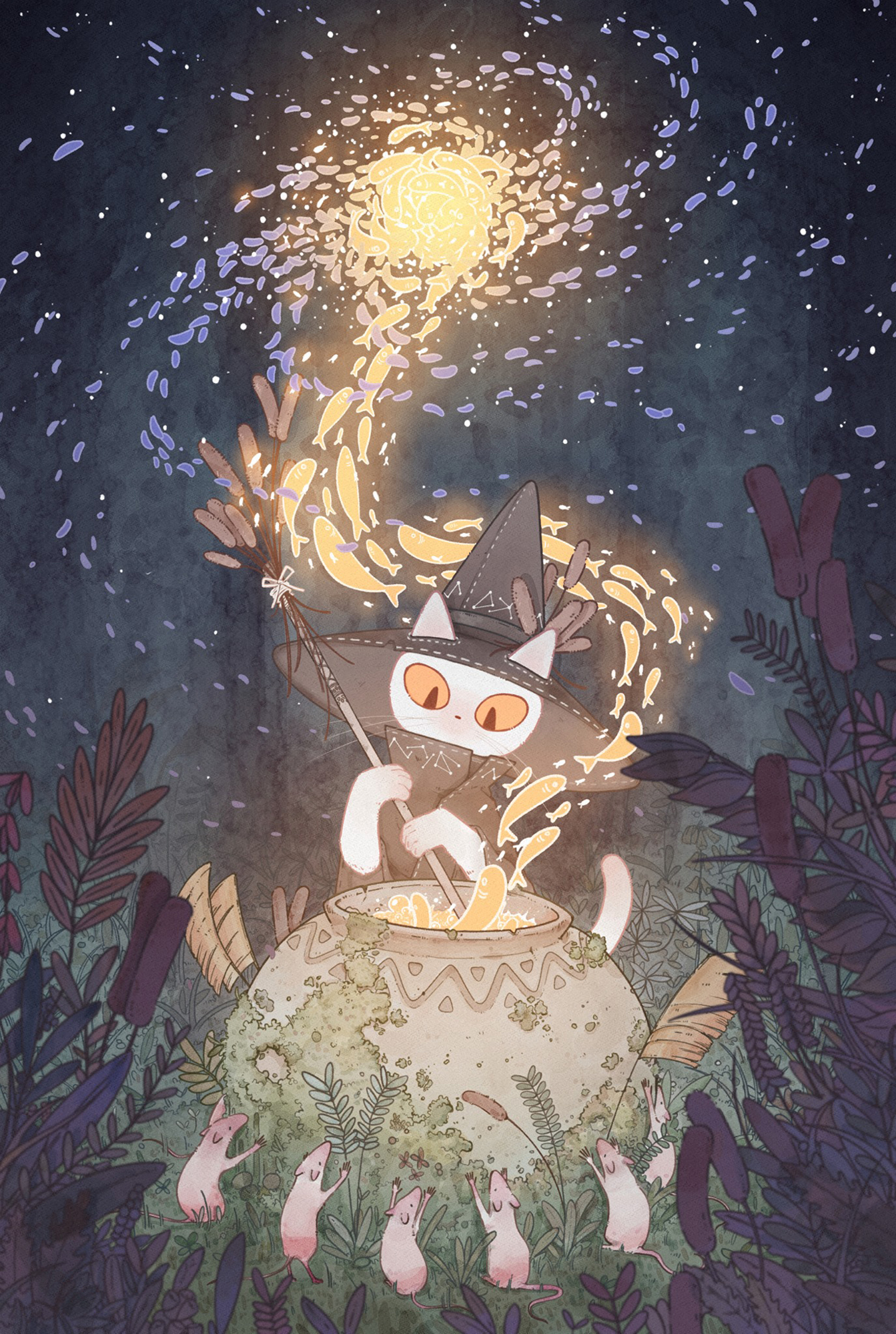 線画、色の塗り方ともにレベルが高く、世界観も独特で目を惹きました。銀河をつくる猫の魔法使いですが、宙にのぼっていく光が魚の形になっているのが面白くこだわりを感じました。