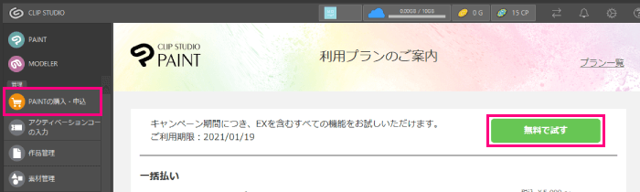CLIP STUDIOを起動し、[PAINTの購入・申込]→[無料で試す]ボタンをクリック。