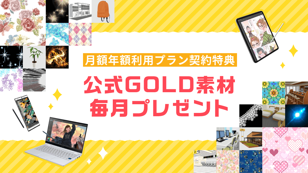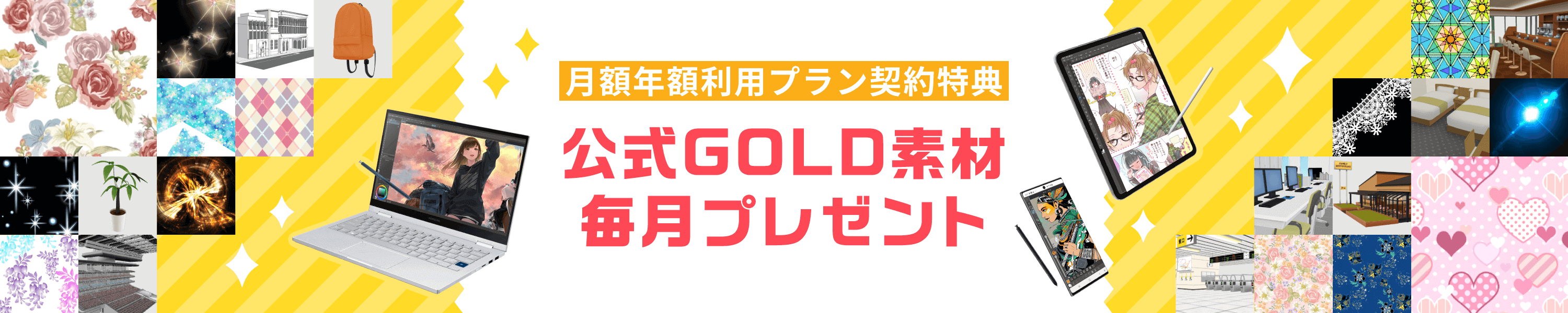 月額・年額利用プランの「1デバイスプラン」「2デバイスプラン」「プレミアムプラン」「スマートフォンプラン」をご契約中のお客様、新規にお申込みのお客様に、CLIP STUDIO ASSETSにて公開している公式GOLD素材の中からお好きな素材を毎月プレゼントいたします。