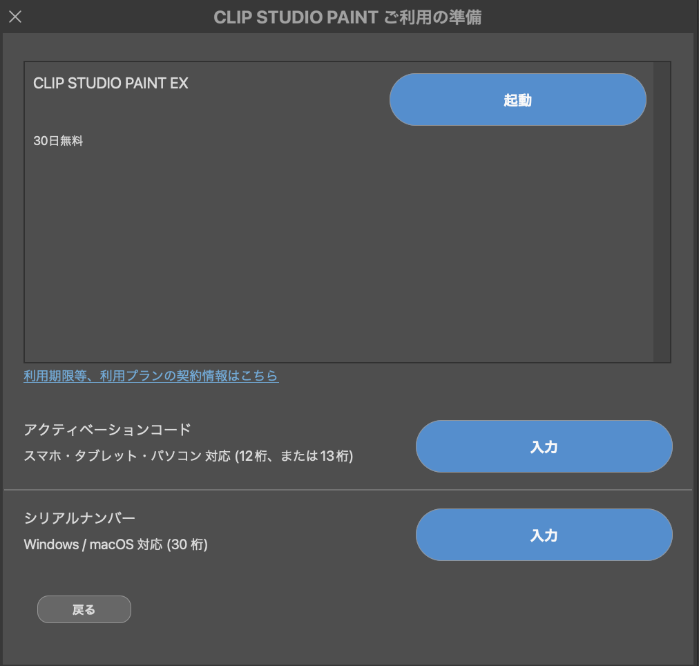 [ヘルプ]メニュー→[ライセンスの確認・変更]→[お持ちのライセンス]内のCLIP STUDIO PAINT EX 30日無料の[起動]ボタンをクリック