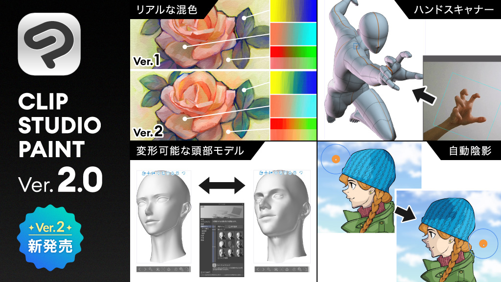 よりリアルなブラシ混色や顔や手の作画を効率化する3D機能など、多数の新機能を搭載