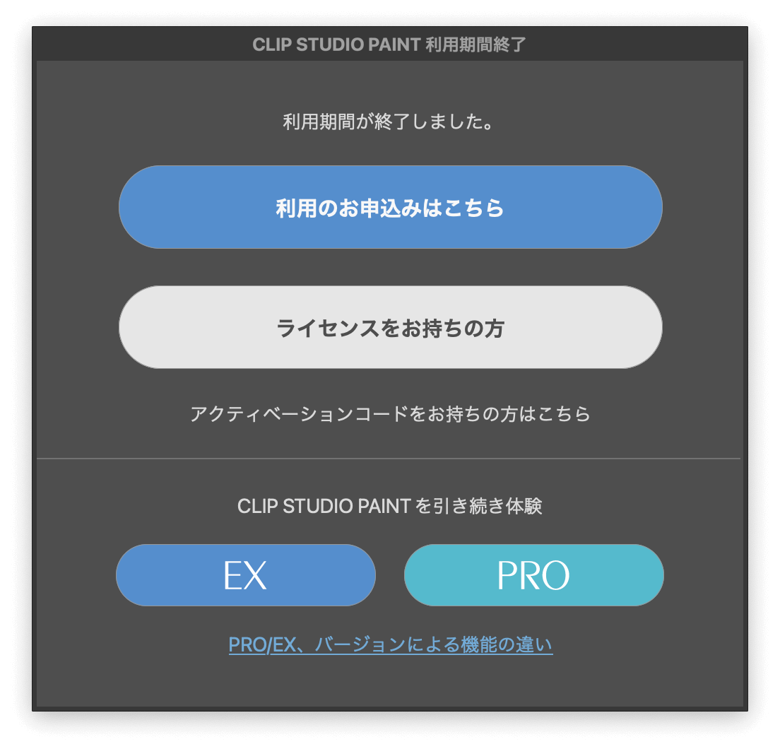 お申込み後にCLIP STUDIO PAINTを起動した際に「利用期間が終了しました」と表示される場合は、[ライセンスをお持ちの方]を選択し、新規にご契約いただいたプランを選択して起動してください。