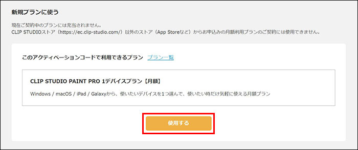3. 購入したアクティベーションコードの内容が表示されますので、ご確認の上[使用する]ボタン押します。