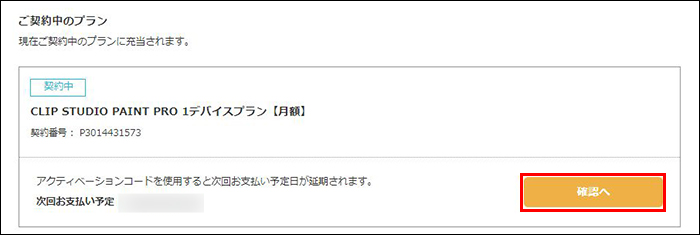 3. ご契約中のプランが表示されますので、アクティベーションコードを適用するプランを選択し、[確認へ]を押します。
