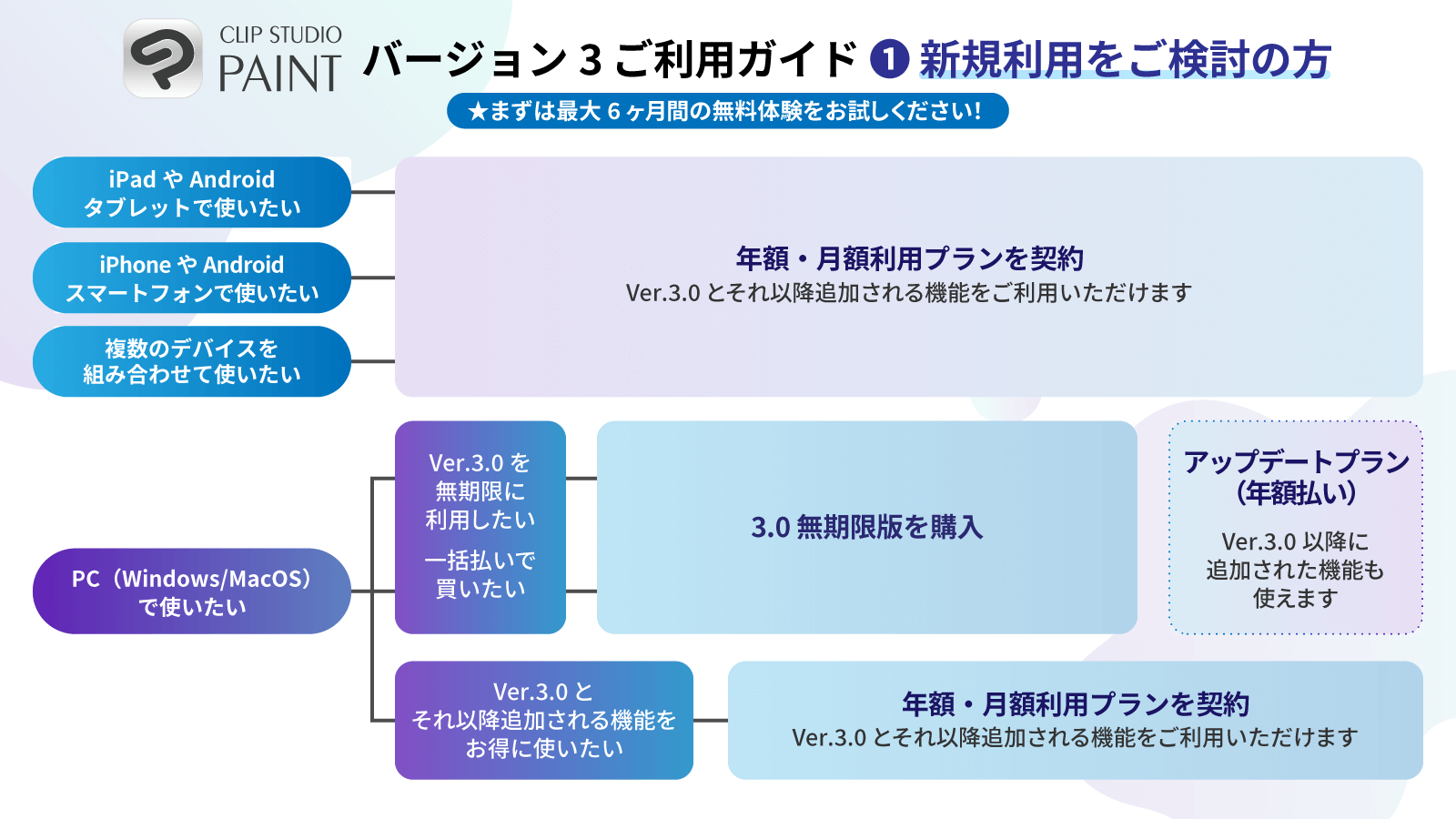 CLIP STUDIO PAINTの現在のご利用状況に応じて、Ver.3.0をご利用いただける方法は異なります。