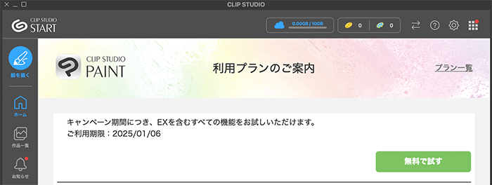 CLIP STUDIOを起動し、[PAINTの購入・申込]→[無料で試す]ボタンをクリック