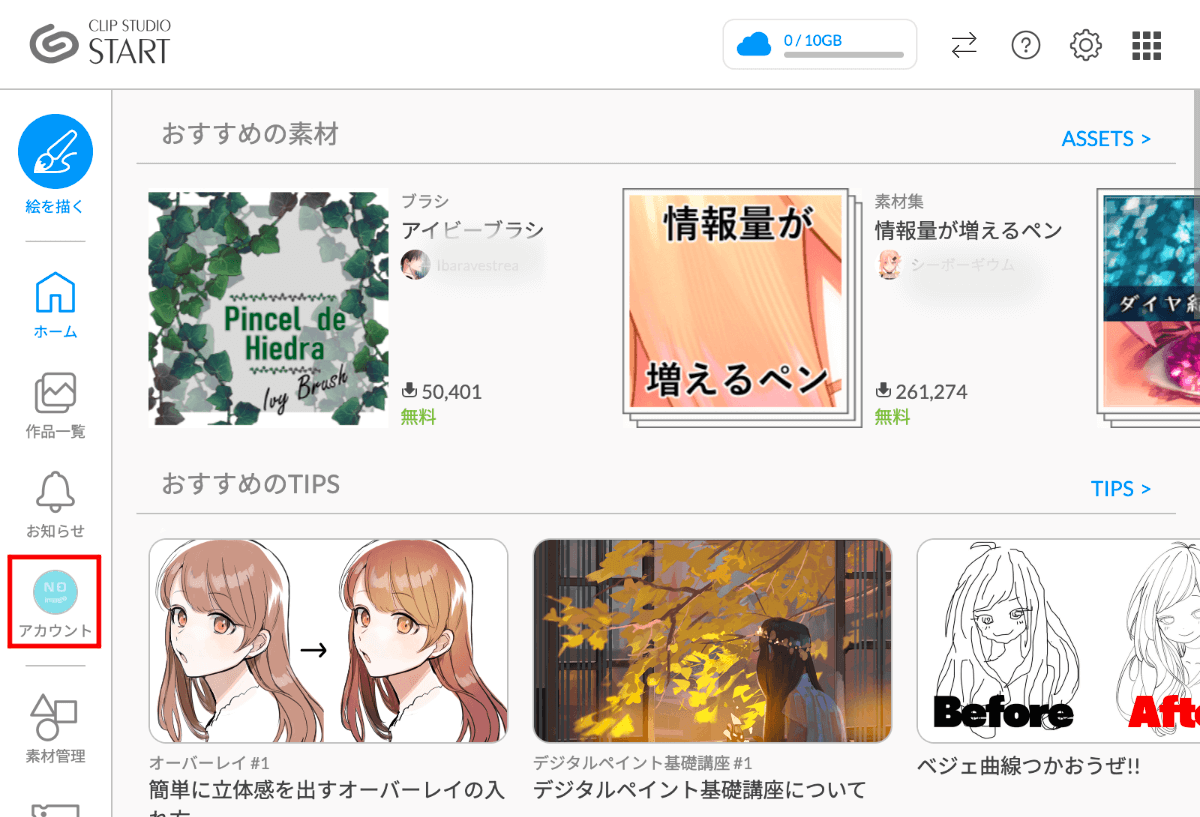 CLIP STUDIO PAINTを起動後、ログインした状態でアカウントのアイコンをタップすると表示される「クラウド」から現在の容量をご確認いただけます。