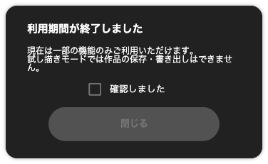 キャンペーン終了後にCLIP STUDIO PAINTを起動すると、以下のダイアログが表示されますので、[確認しました]にチェックを入れて、[閉じる]をクリックしてください。