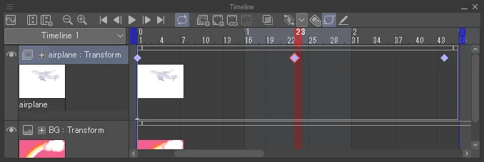 아래의 애니메이션에서는 비행기의 위치를 3개의 키 프레임으로 설정했습니다. 이 방법을 사용하면 하나의 애니메이션 레이어만으로 이 움직임을 표현할 수 있습니다.