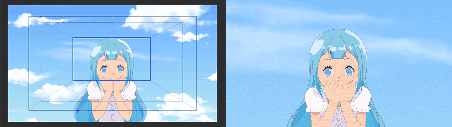아래 예에서 파란색 테두리는 최종 출력 크기, 회색 선은 카메라 움직임을 나타냅니다. 출력 영역 밖에 배경을 그려 더 역동적인 효과를 추가할 수 있습니다.