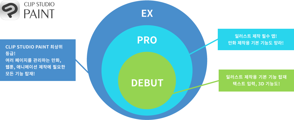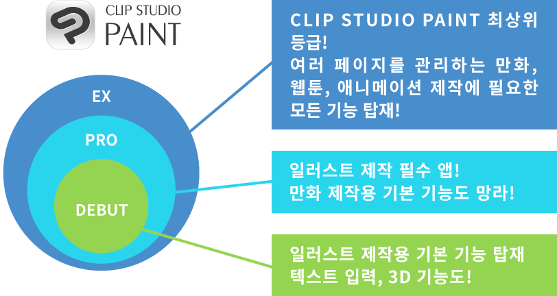 'PRO', 'EX'의 상위 버전은 라이선스를 변경하면 업그레이드 완료! 편리한 기능이 속속 추가되어 더 자유롭게 커스터마이즈할 수 있습니다. 표현의 폭도 넓어져 원하는 작품을 더 빠르게 만들 수 있습니다!