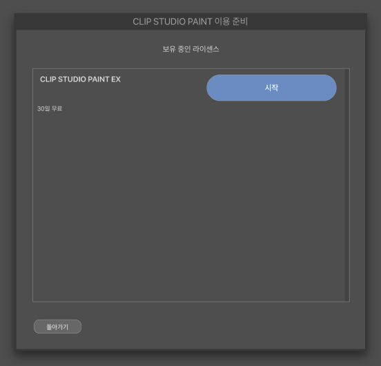 [라이센스 확인/변경] → [보유 중인 라이센스] 내의 CLIP STUDIO PAINT PRO의 [시작] 버튼 클릭
