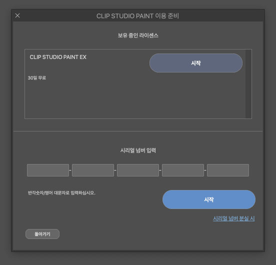 [도움말] 메뉴 → [라이센스 확인/변경] → [보유 중인 라이센스] 내의 CLIP STUDIO PAINT EX 30일 무료의 [시작] 버튼 클릭
