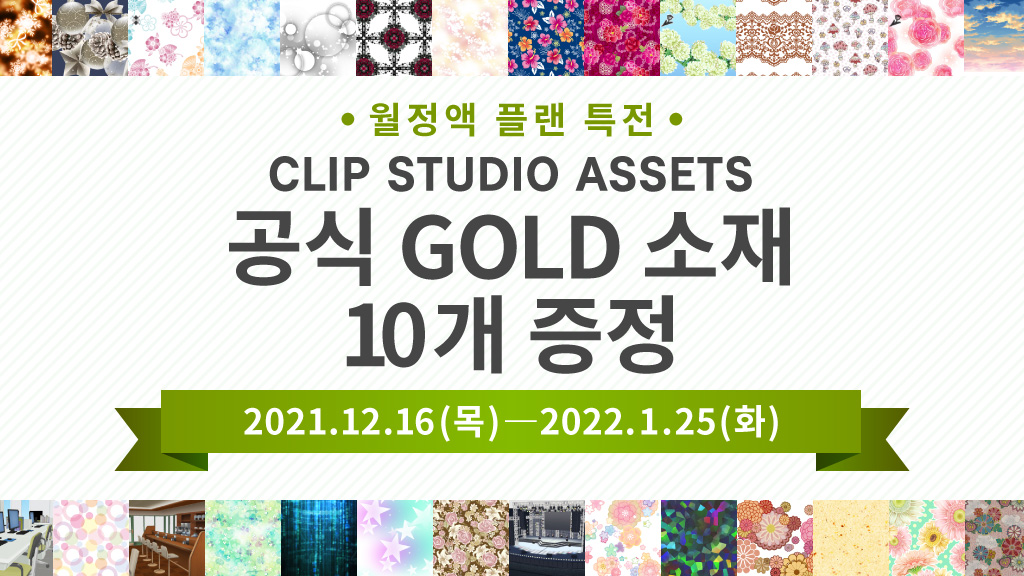 월정액 플랜 중 '기기 1대 플랜' '기기 2대 플랜' '프리미엄 플랜'을 새로 신청한 고객님과 계약 중인 모든 고객님께 CLIP STUDIO ASSETS에 공개된 공식 GOLD 소재 500개 중에서 원하는 소재를 10개 증정하겠습니다.