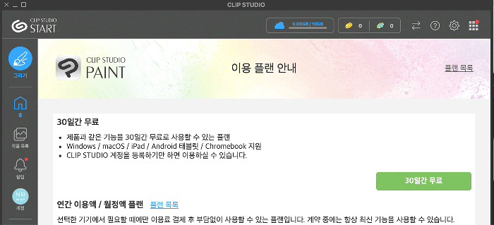 CLIP STUDIO를 시작하여 [PAINT 구입/신청] → [30일간 무료] 버튼 클릭