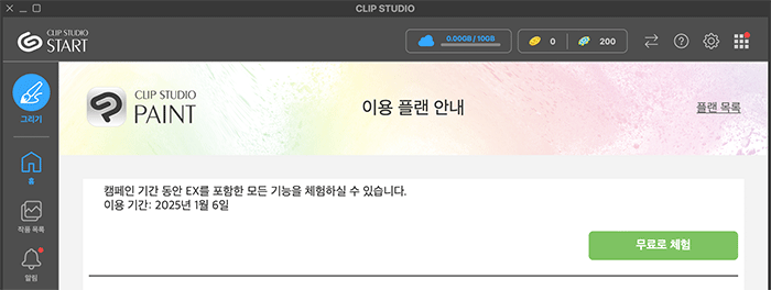 CLIP STUDIO를 시작하여 [PAINT 구입/신청] → [무료로 체험] 버튼 클릭
