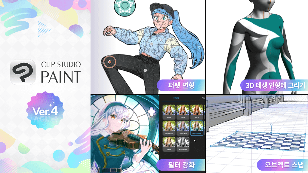 Ver.4.0에서는 인형을 움직이듯 변형할 수 있는 퍼펫 변형, 색조 보정 및 필터를 미리보기로 비교하면서 적용할 수 있는 인터페이스 등의 마무리/가공 관련 기능 강화, 오브젝트 배치 스냅 지원, 그림에 참고할 수 있는 3D 기능 강화 등 보다 정확하고 빠르게 그릴 수 있어 작품 제작이 더욱 즐거워지는 기능을 추가하고 조작성을 개선했습니다.