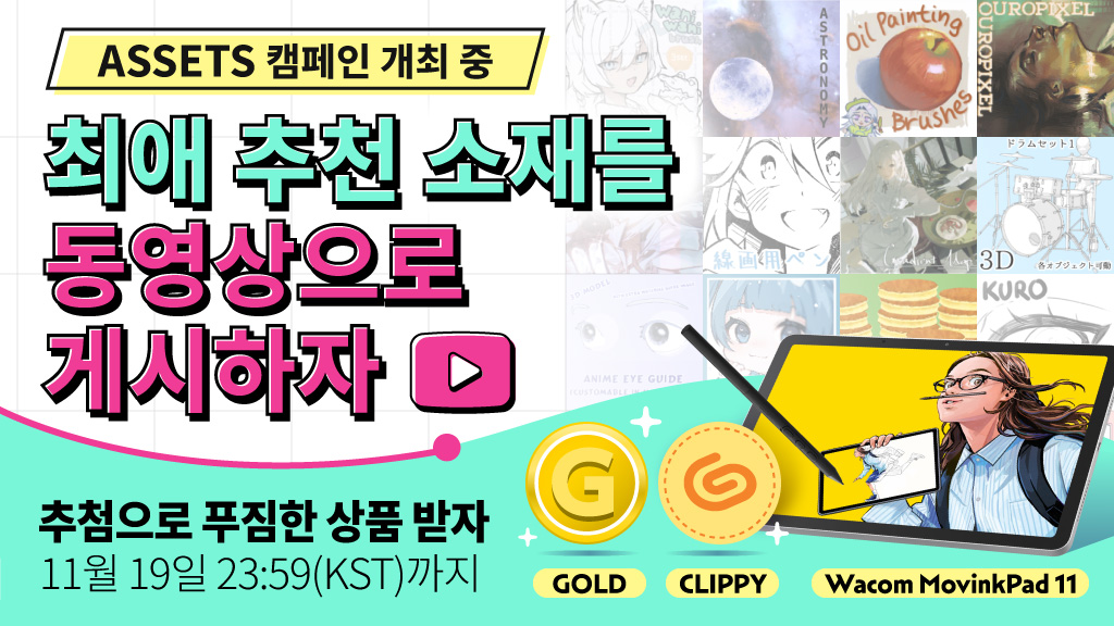 최애하는 소재를 사용해 CLIP STUDIO ASSETS 소재의 매력을 소개하는 숏폼 동영상을 SNS(X, Instagram, Facebook, TikTok)에 게시하세요.