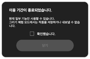 캠페인 종료 후 CLIP STUDIO PAINT를 시작하면 다음과 같은 다이얼로그가 표시되므로 [확인했습니다.]를 선택하고 [닫기]를 클릭하세요.
