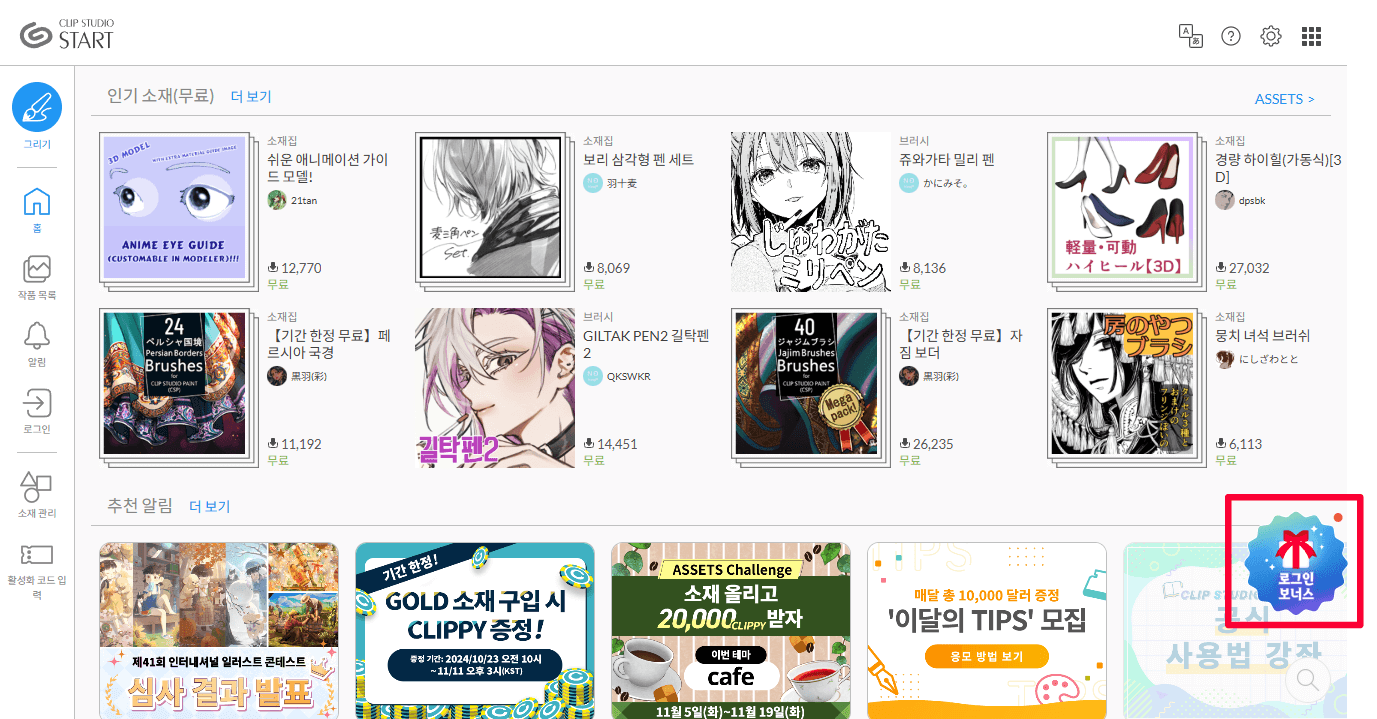 CLIP STUDIO를 시작하여 홈 화면의 '로그인 보너스'를 클릭하고 CLIP STUDIO 계정으로 로그인합니다.
