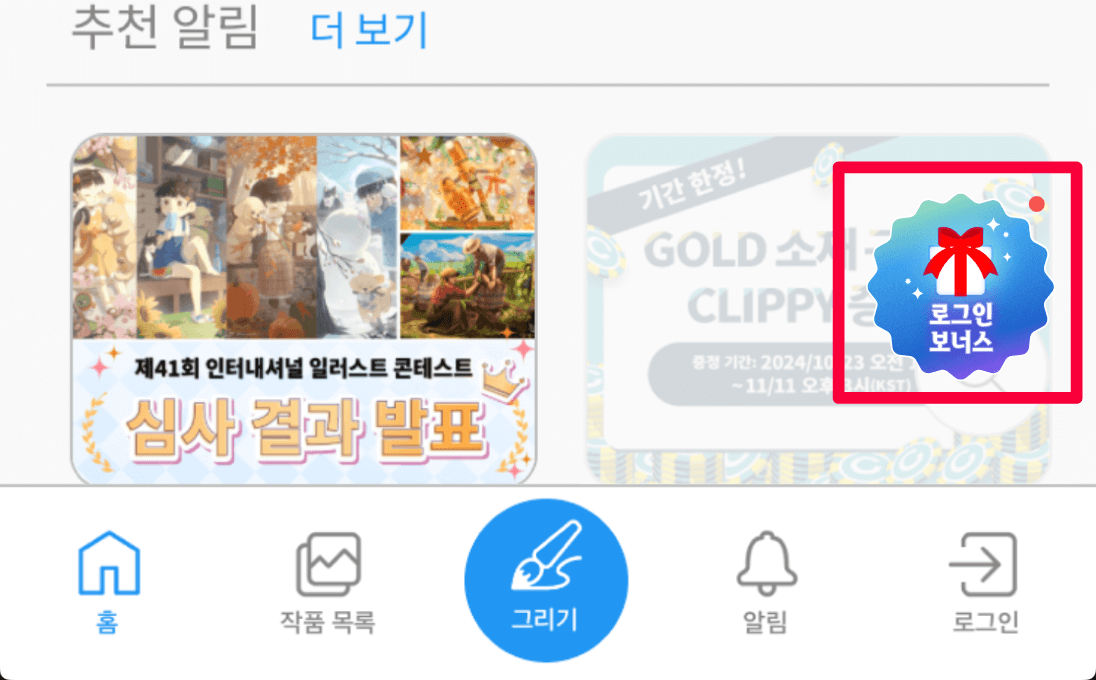 앱을 시작하여 홈 화면의 '로그인 보너스'를 탭하고 CLIP STUDIO 계정으로 로그인합니다.