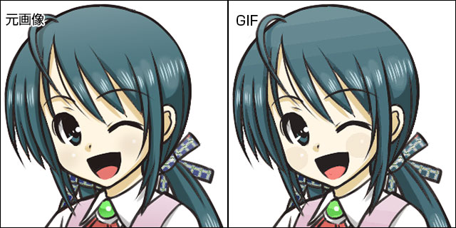 GIF形式は、色数の少ない作品の保存に向いている形式です。最大256色までしか表現できないため、ファイルサイズを小さくできます。グラデーションなどの階調がある場合、下図のように段差が発生します。GIFもPNG同様に透明部分の情報を持った画像ファイルを作成できます。