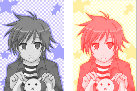 CMYKのM(マゼンタ)を蛍光ピンクに差し替えて印刷したもの。蛍光ピンクに差し替えると、肌色が鮮やかに発色されます。少し淡い色になるため水彩のような淡い塗ではとてもきれいな発色になります。ただし、マゼンタが蛍光ピンクに替わるためマゼンタの入った赤などは変色します。赤がオレンジに発色される可能性が高いのを念頭に入れておきましょう。