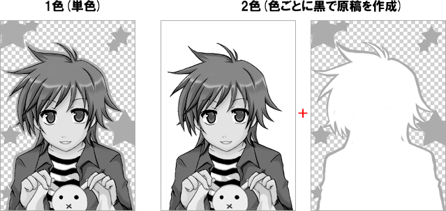 基本的に単色刷りと作り方は同じですが、2つの色で刷るため、それぞれの色に分かれたデータや原稿を作成します。