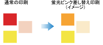 蛍光ピンクとマゼンタを印刷会社独自の製法で混合したインクを使って印刷したもの。通常印刷よりは鮮やかになります。独自のインクを使用しているのでそれぞれの印刷会社によって仕上がりの色に差があります。扱っている印刷会社も少数です。
