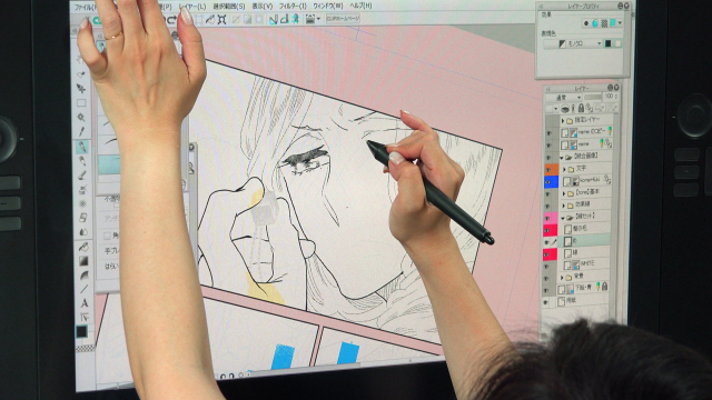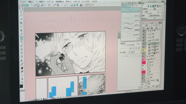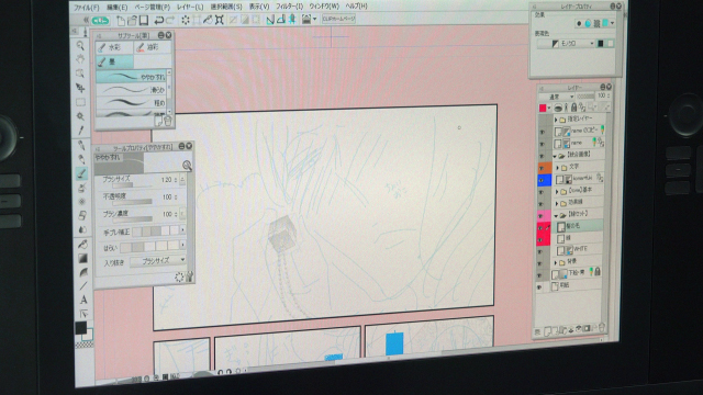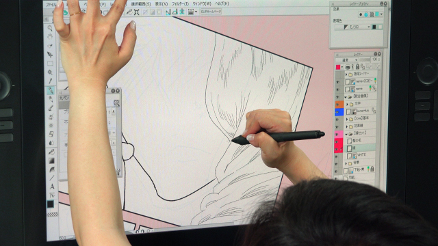 まずペン入れです。デジタルでは多彩なブラシが準備されており、自分の理想のペンタッチまでカスタマイズすることが可能です。阿仁谷ユイジ先生もブラシをカスタムされているようでした。