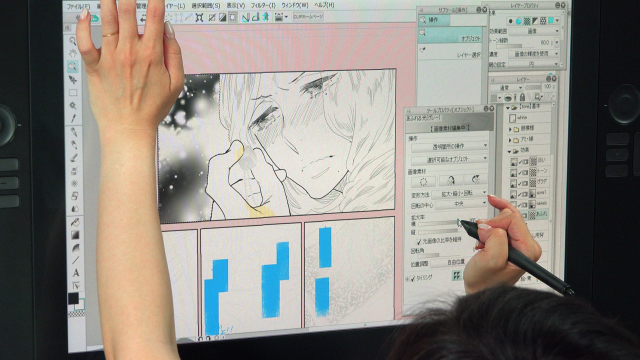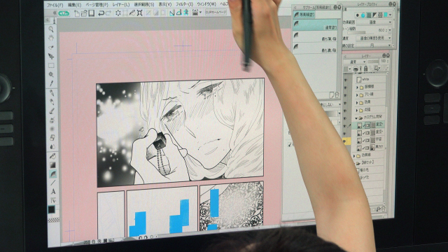 左手へ、背景とは異なるトーンを追加していきます。デジタルでは、トーンの種類も豊富でトーン代もかかりません。各種トーンをイメージに合うまで何度も試すことができます。