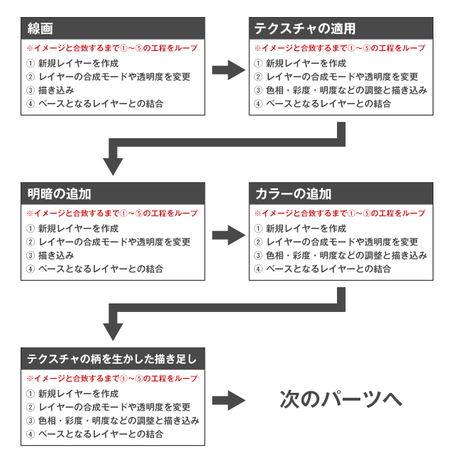 「線画→テクスチャの適用→明暗の追加→カラーの追加→テクスチャの柄を生かした描き足し」