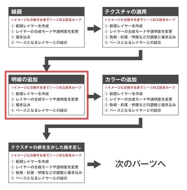 今回は下図、赤枠内の工程「明暗の追加」を見ていきます。手順の前後や若干の差異はありますが、下図を思い浮かべながら実際の作業の流れをみていくと解りやすいかと思います。特にどのようにレイヤーが使用されているかに注目しながら作業を確認してみてください。